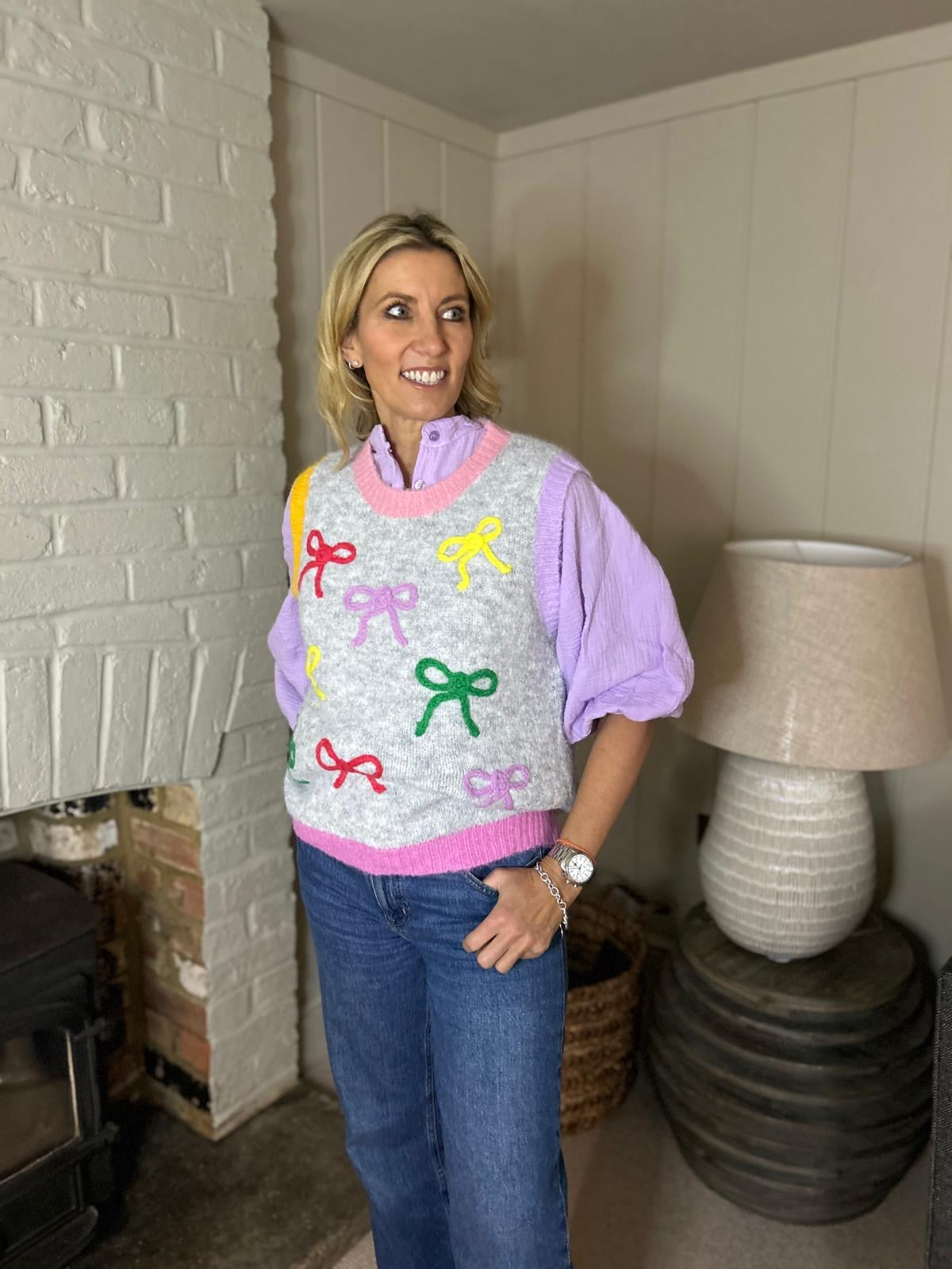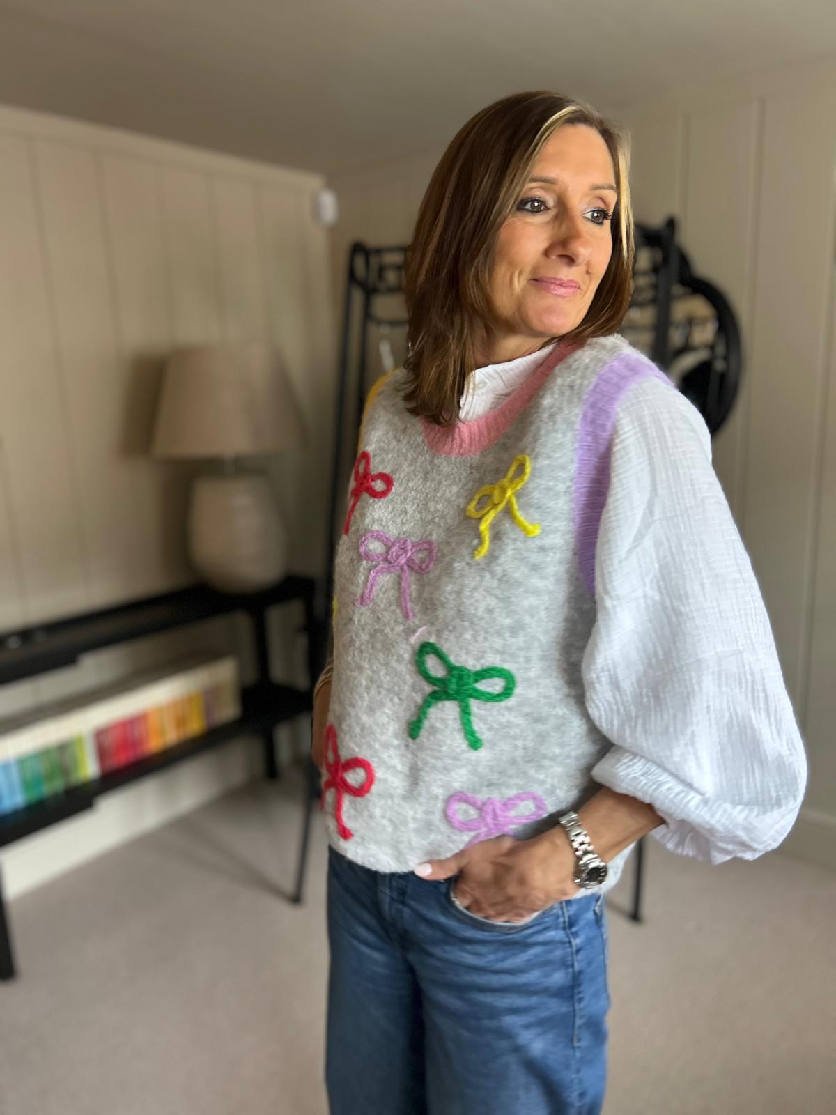Add a touch of charm and elegance to your look with this soft grey knit tank. Crafted from a breathable, cozy knit, it’s perfect for layering with a crisp white tee or a sleeved shirt or base layer. The colorful embroidered bow detail adds a playful, whimsical touch, while the multicolor edging gives it a unique, vibrant finish.