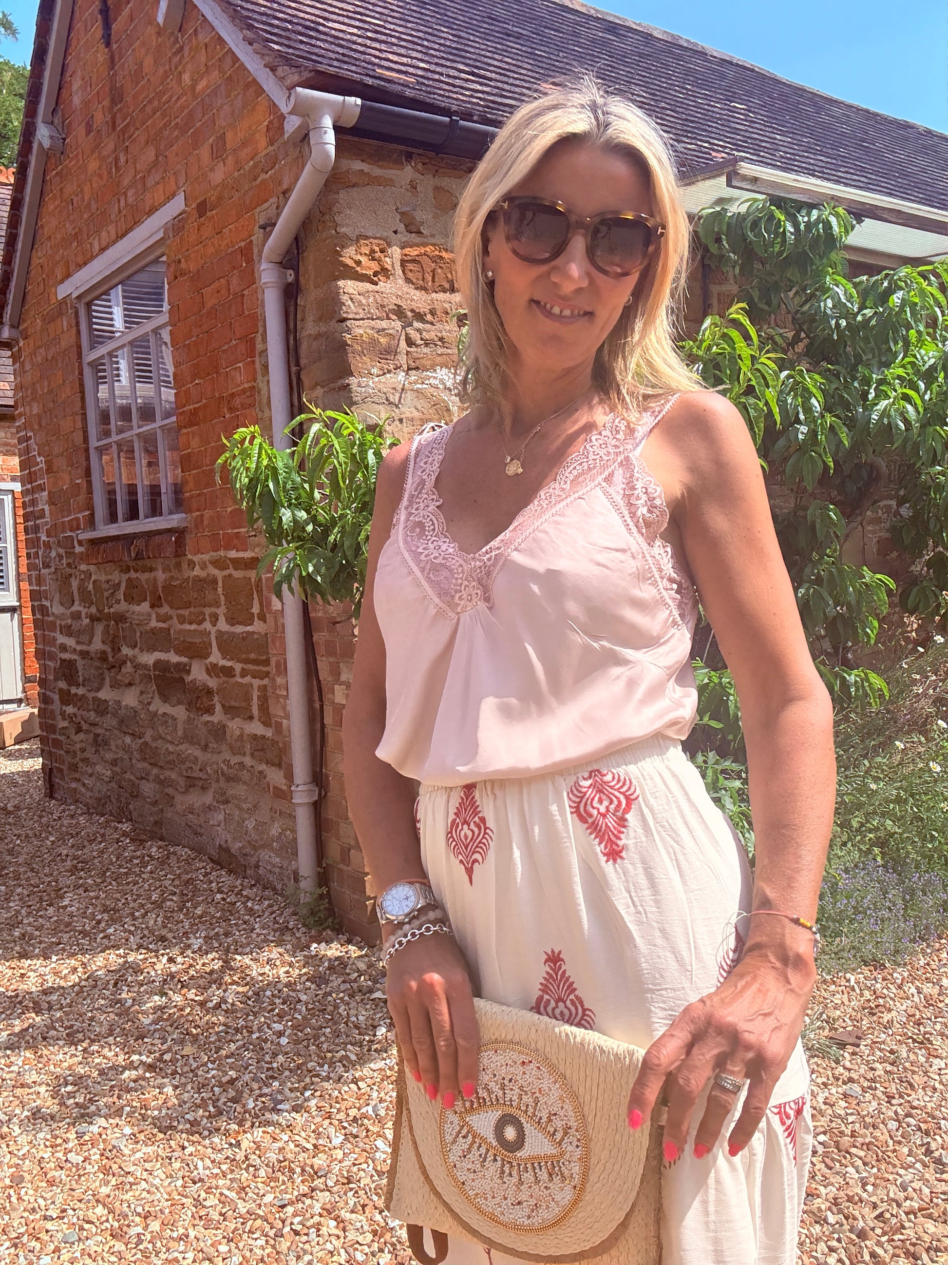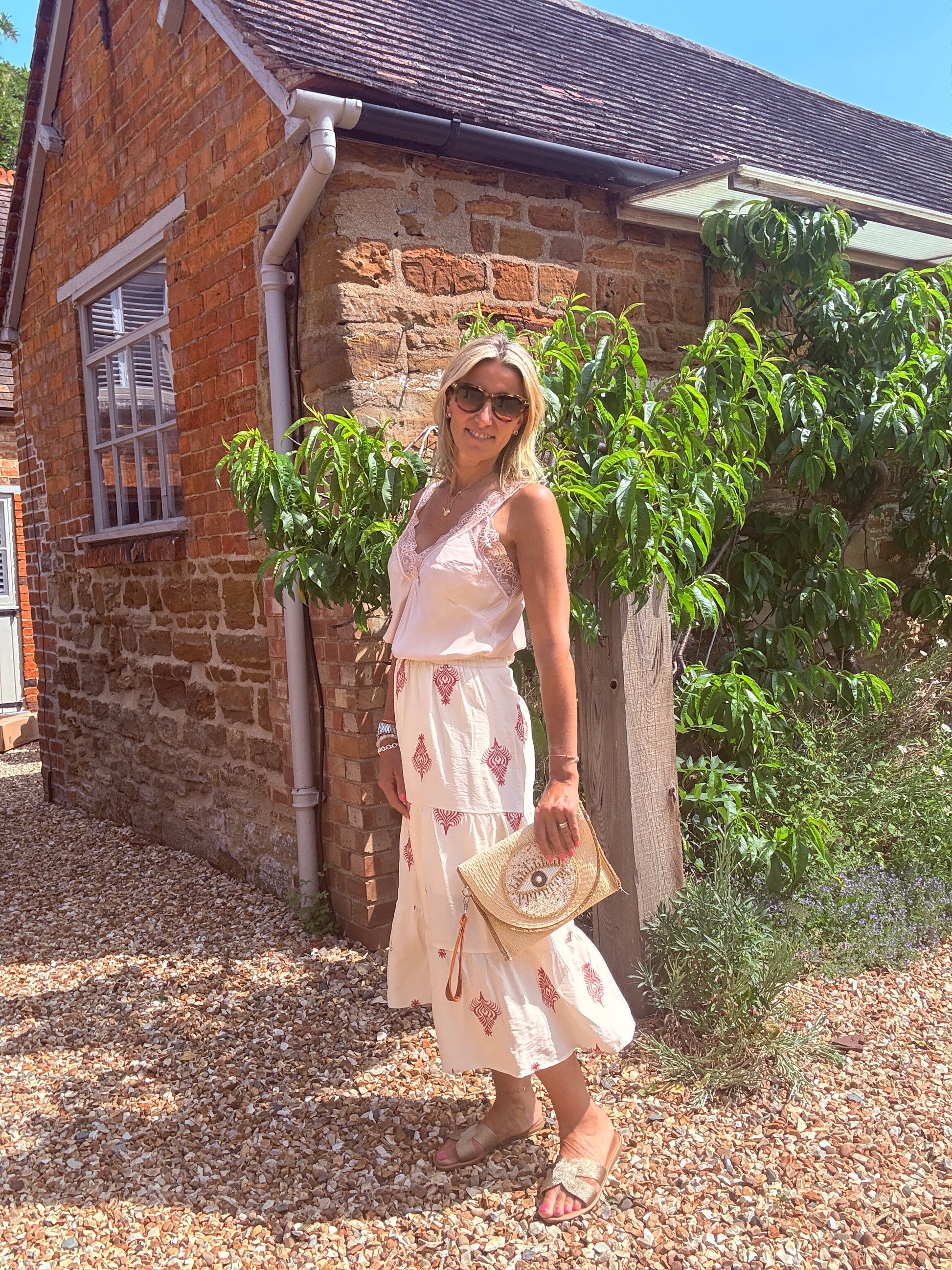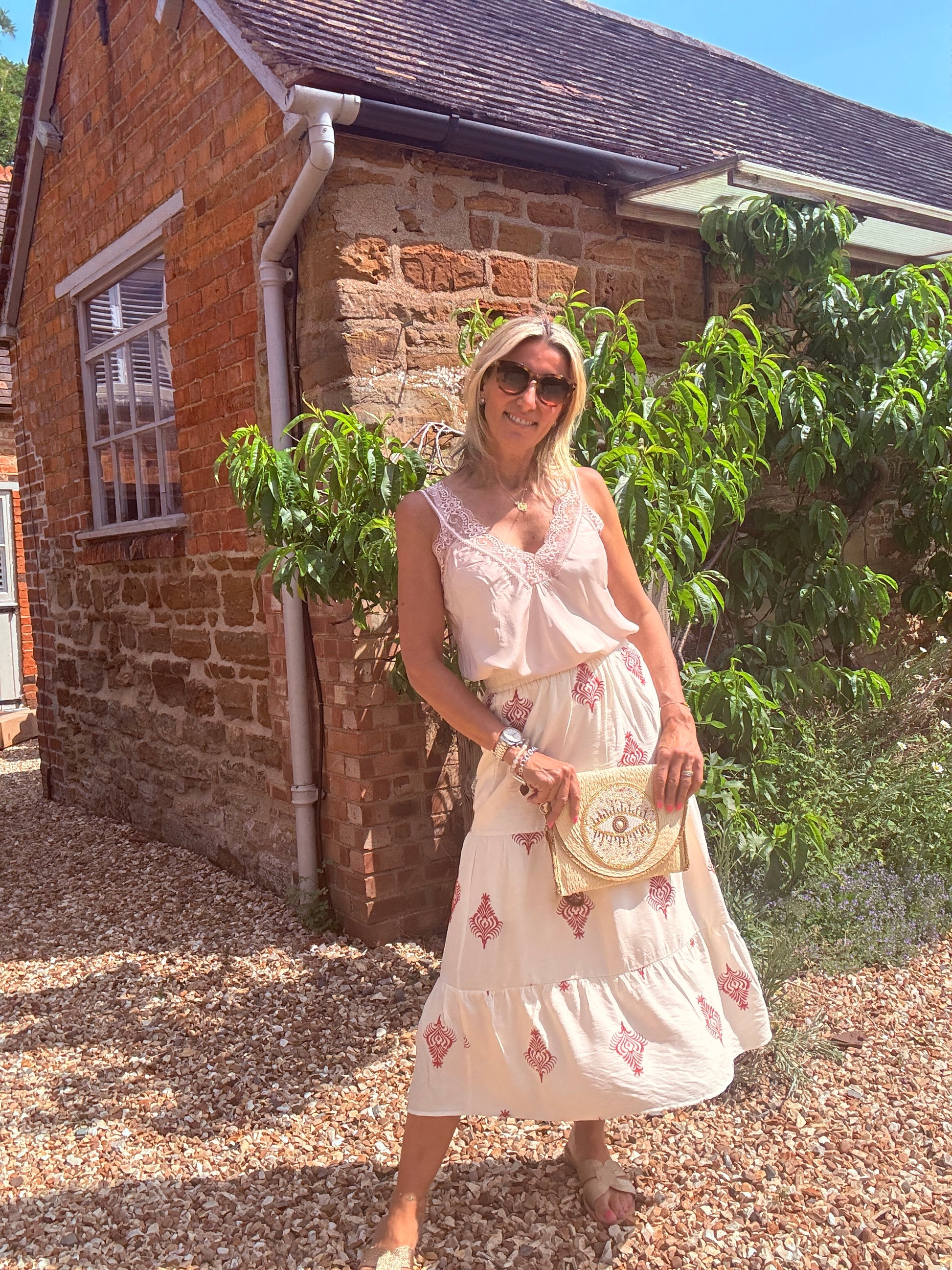 Your new summer style essential, a midi skirt that suits all occasions! The pretty tiered shape and deep elasticated waistband make this Callie skirt super flattering and easy to wear. It has the softest ivory colour fabric with beautiful terracotta embroidered motifs.