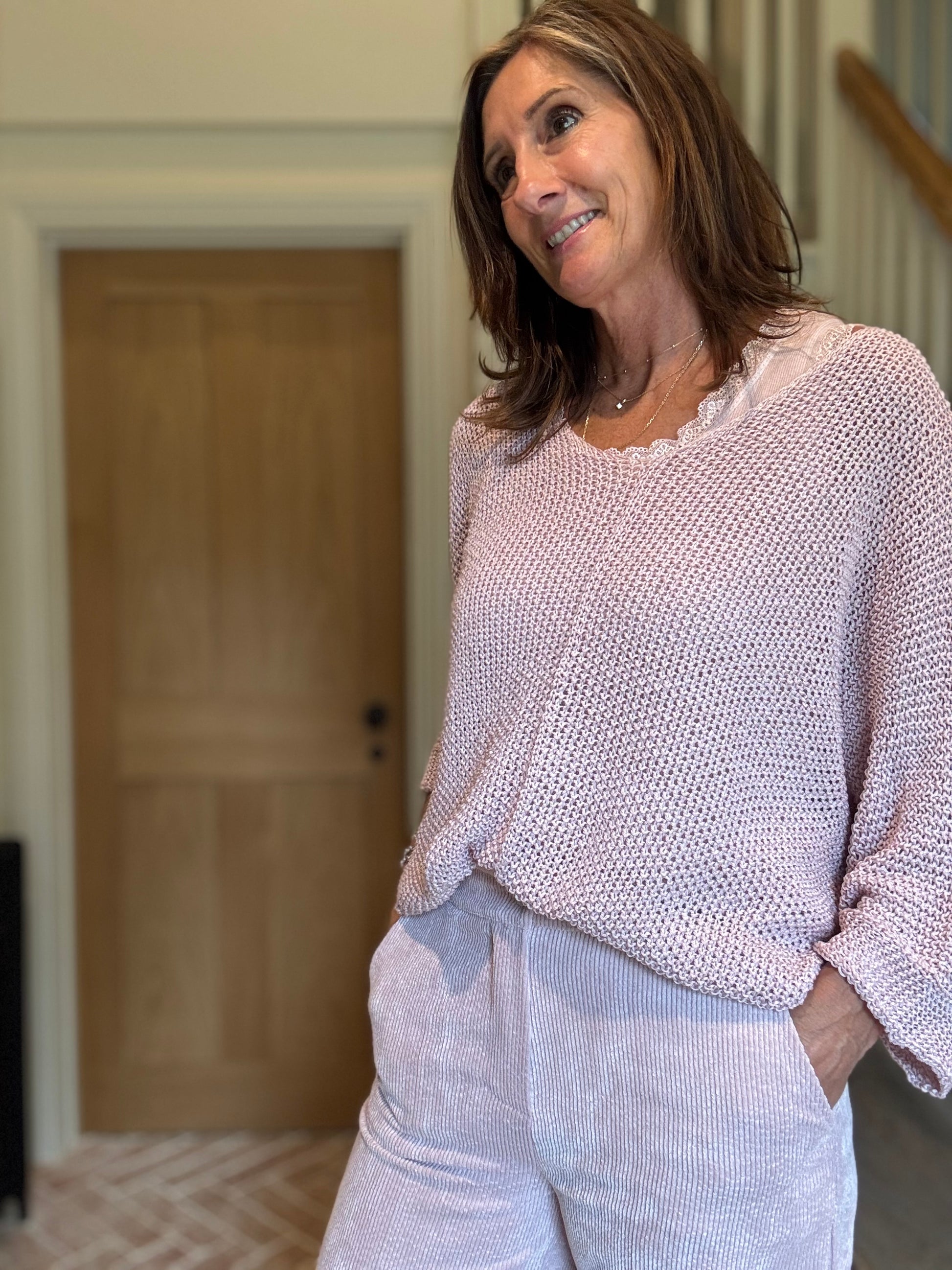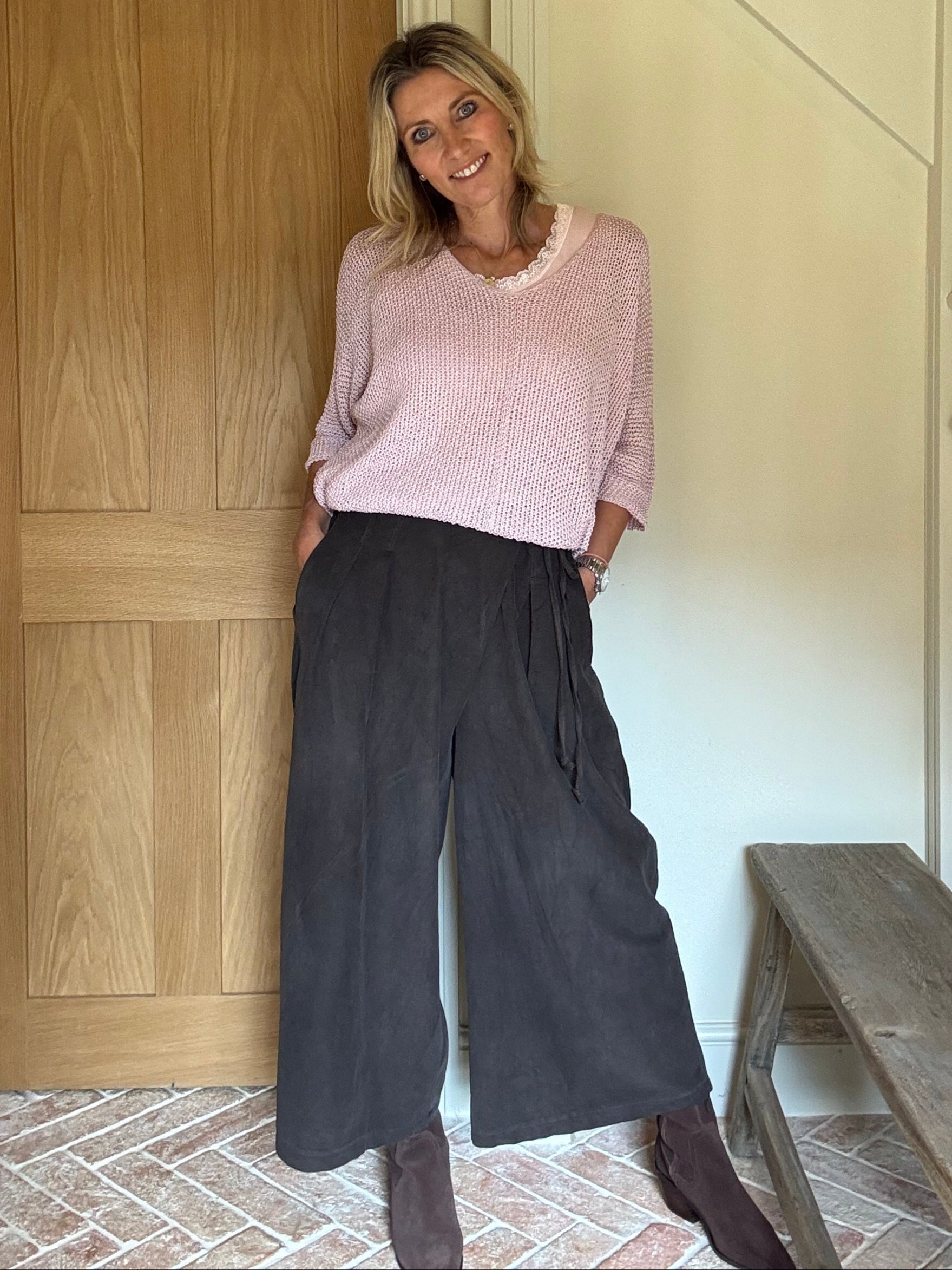 This is the perfect everyday jumper, you can team this with our soft cami vests and pop over jeans for a relaxed paired back look. Available in old rose pink and grey, the neckline is a gentle v shape and the hem drops slightly longer at the back for a flattering shape, with three quarter bat wing sleeves.