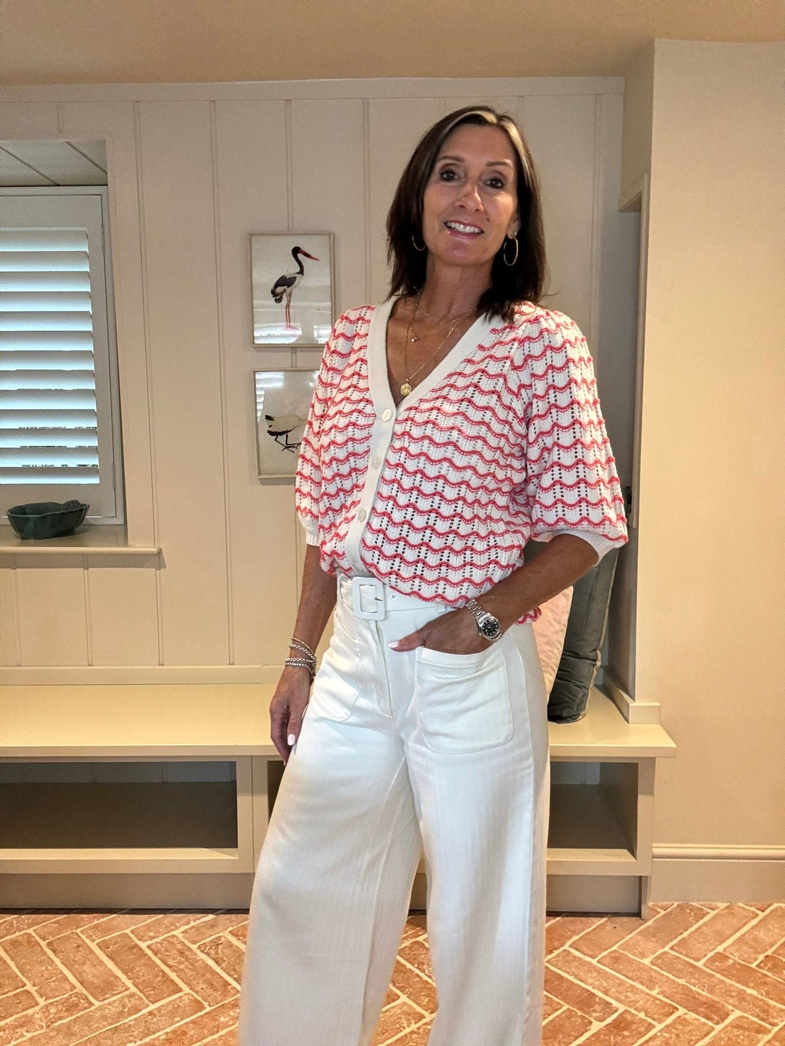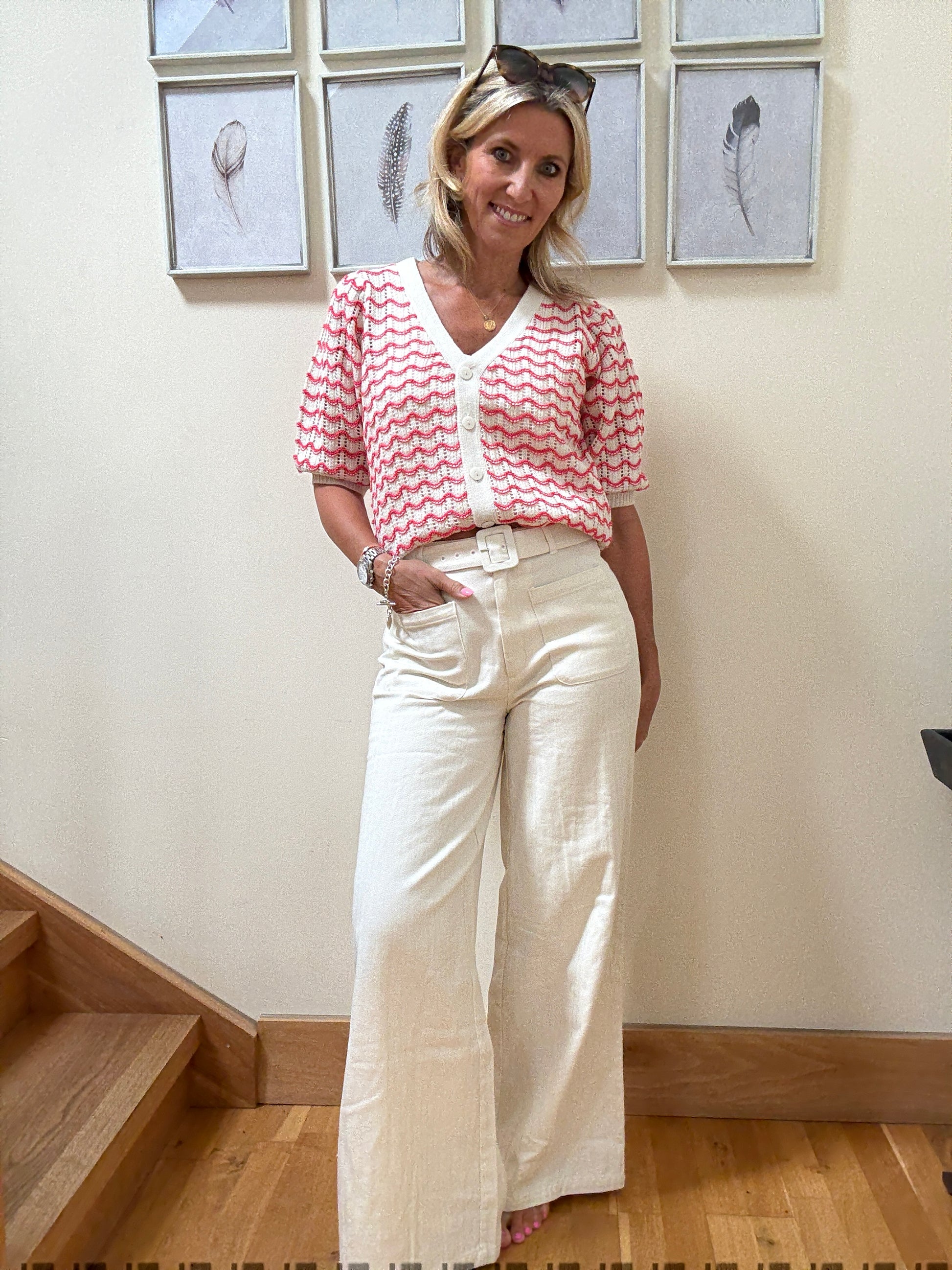 This showstopper short sleeved cardigan has a soft coral stripe, a deep v neck with pretty puff sleeves and contrast hem. Perfect coloring for summer and taking into cooler autumn days.