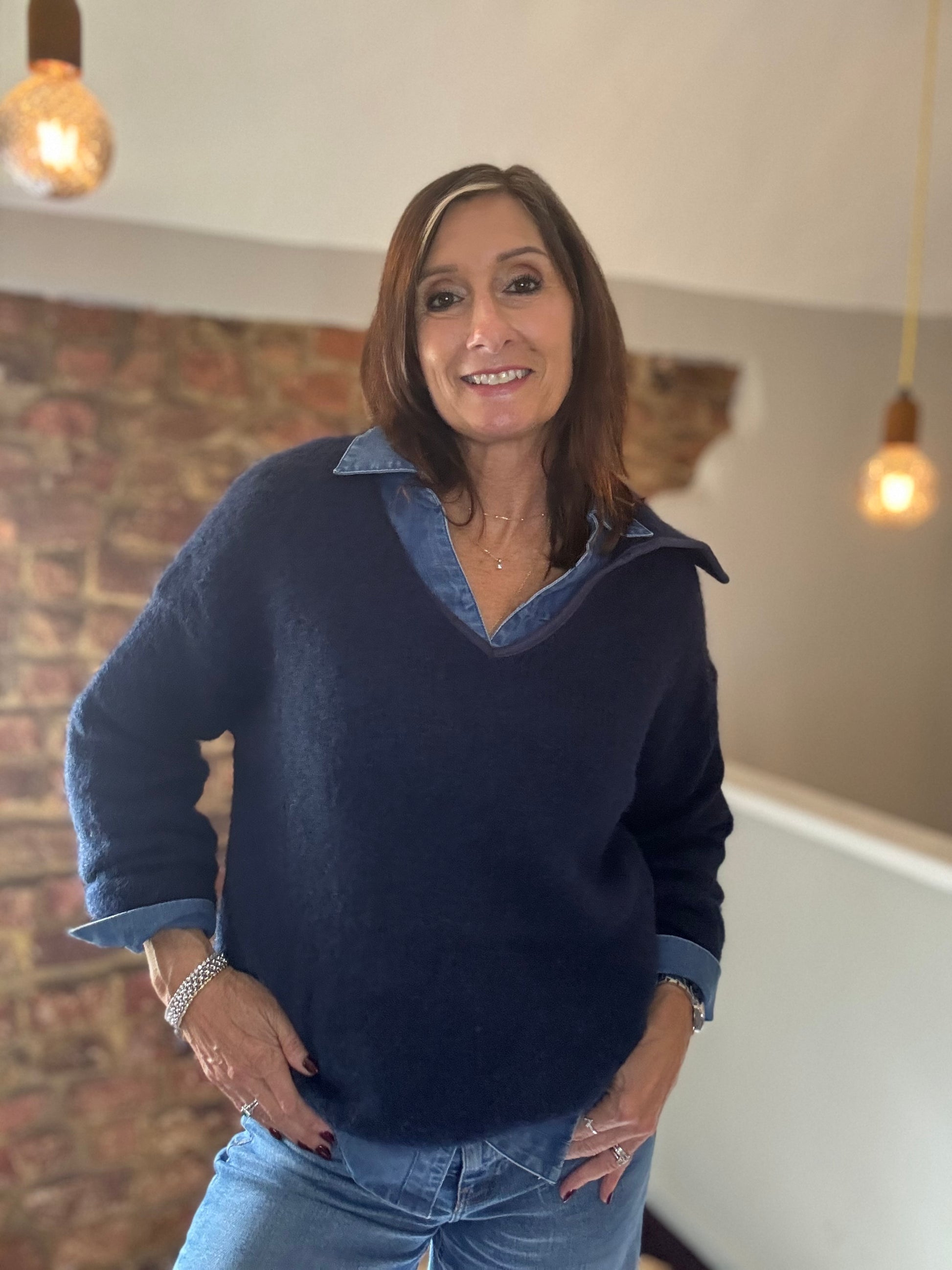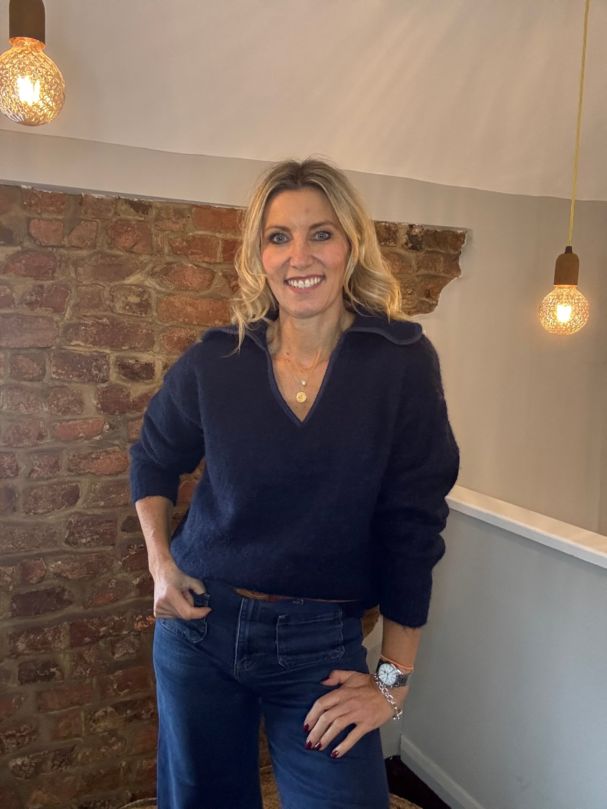 A cosy and stylish knit with a cute contrast trim collar and super flattering v neck shape. Perfect with jeans and cords in a soft wool and polyester mix. Available in two colourways, warm oatmeal and marine blue and one size for a slouchy and oversized fit