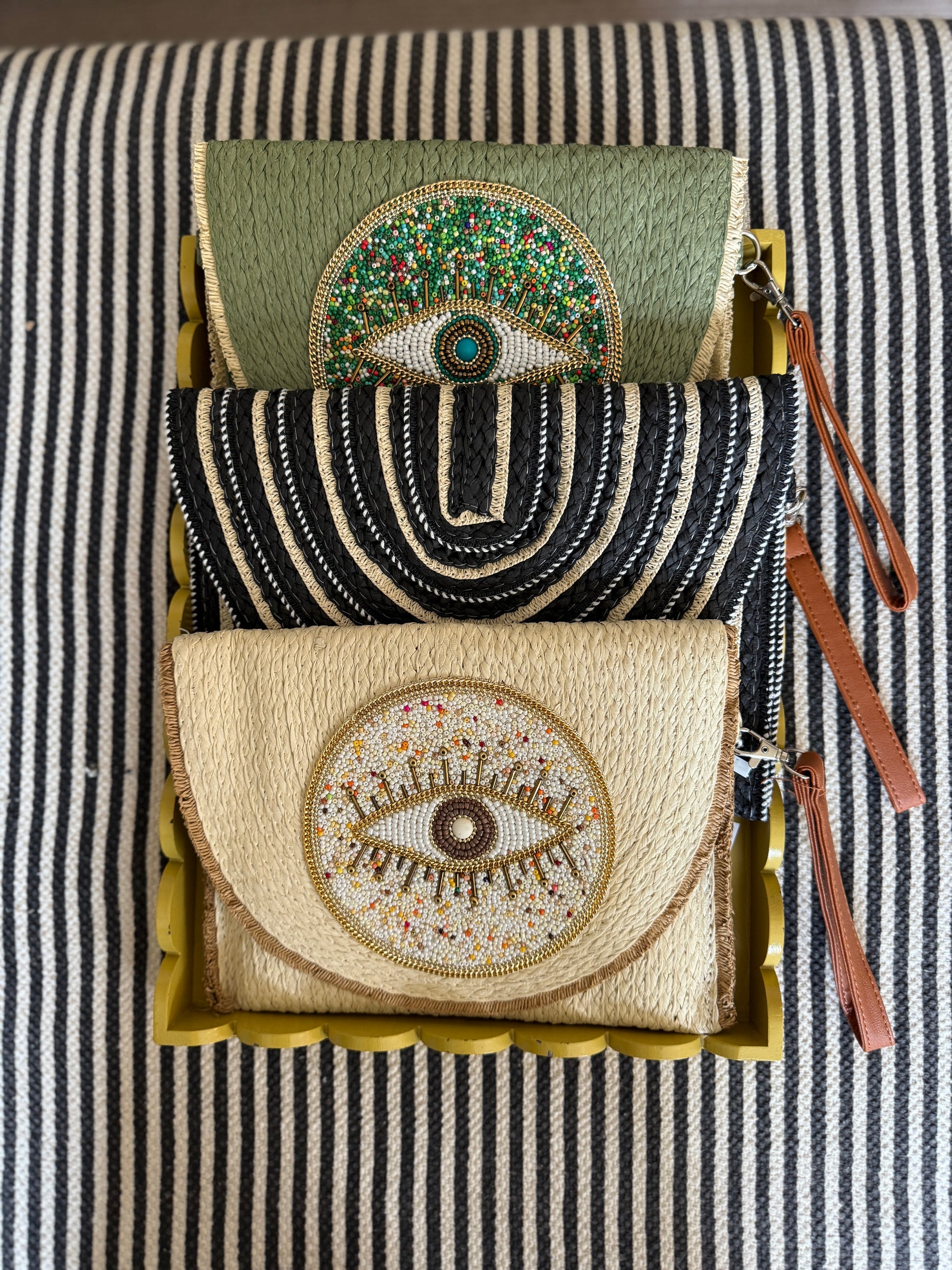 A pretty addition to your holiday wardrobe. This is a bag that’s big enough for your phone and other essentials and has a handy faux leather wrist strap as well a detachable shoulder strap. Available in khaki and cream