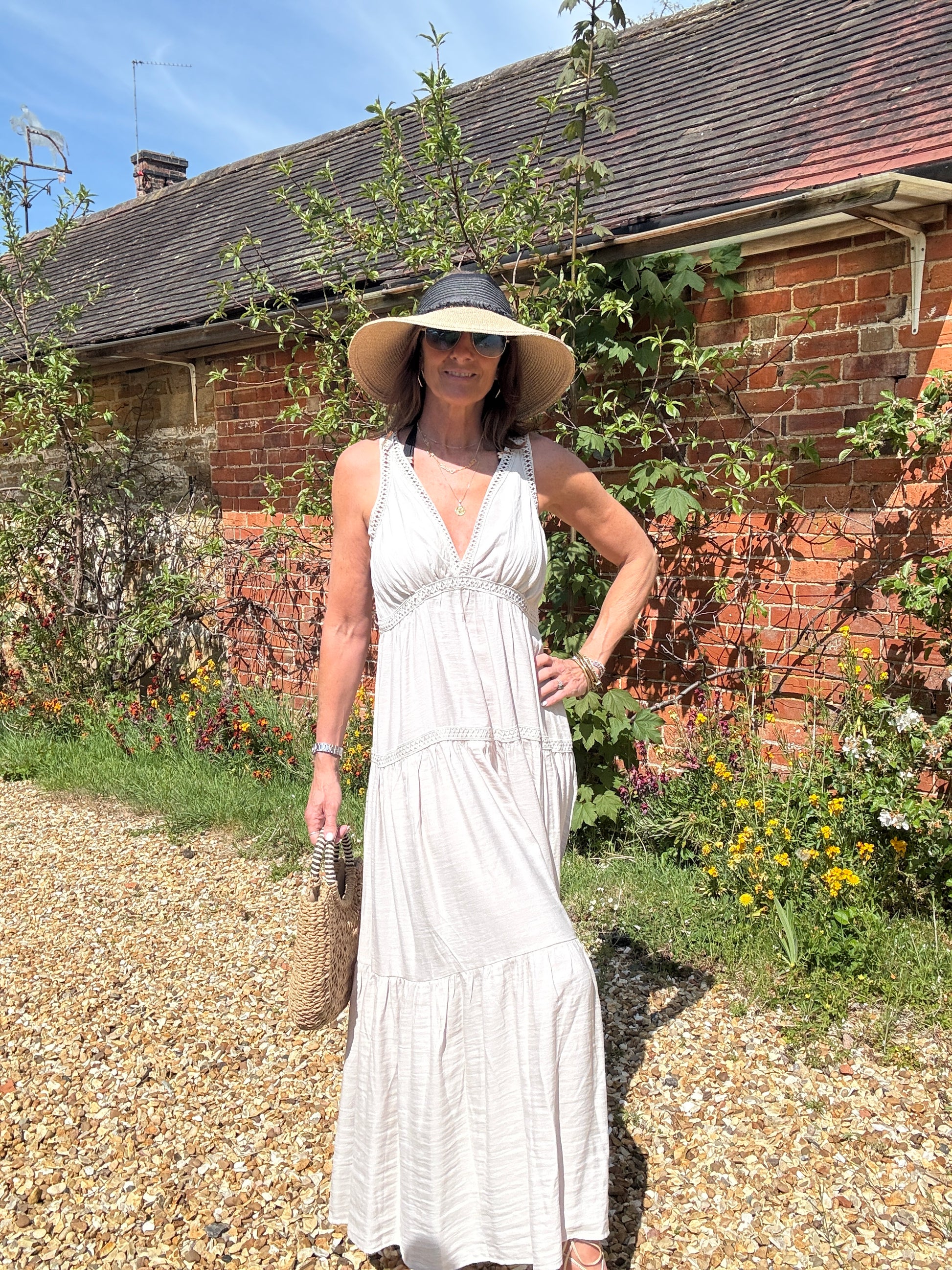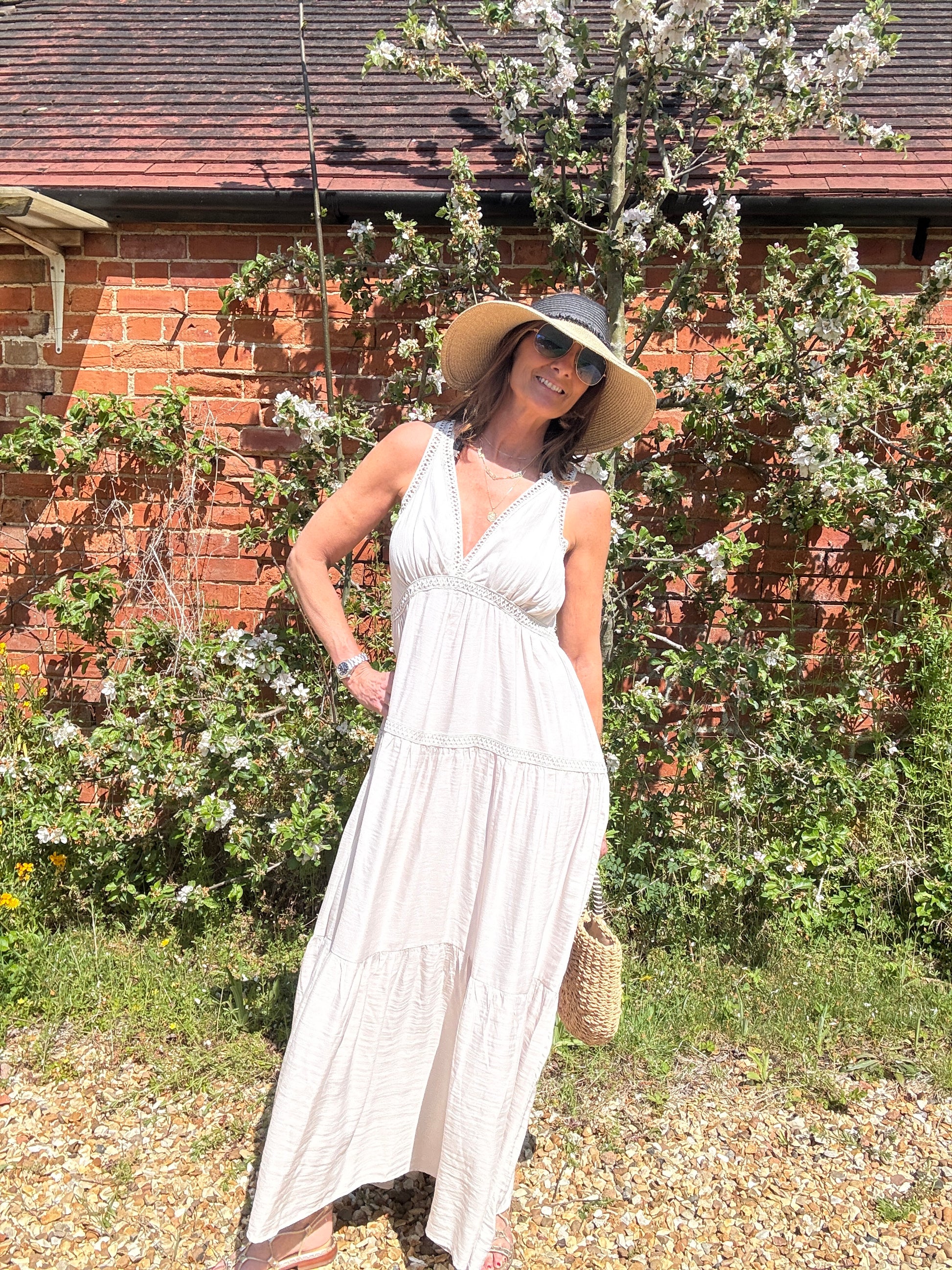 This elegant simple cotton dress with tiered and open stitch detail is perfect for your Summer holiday. Lightweight and neutral this dress will work for you!.