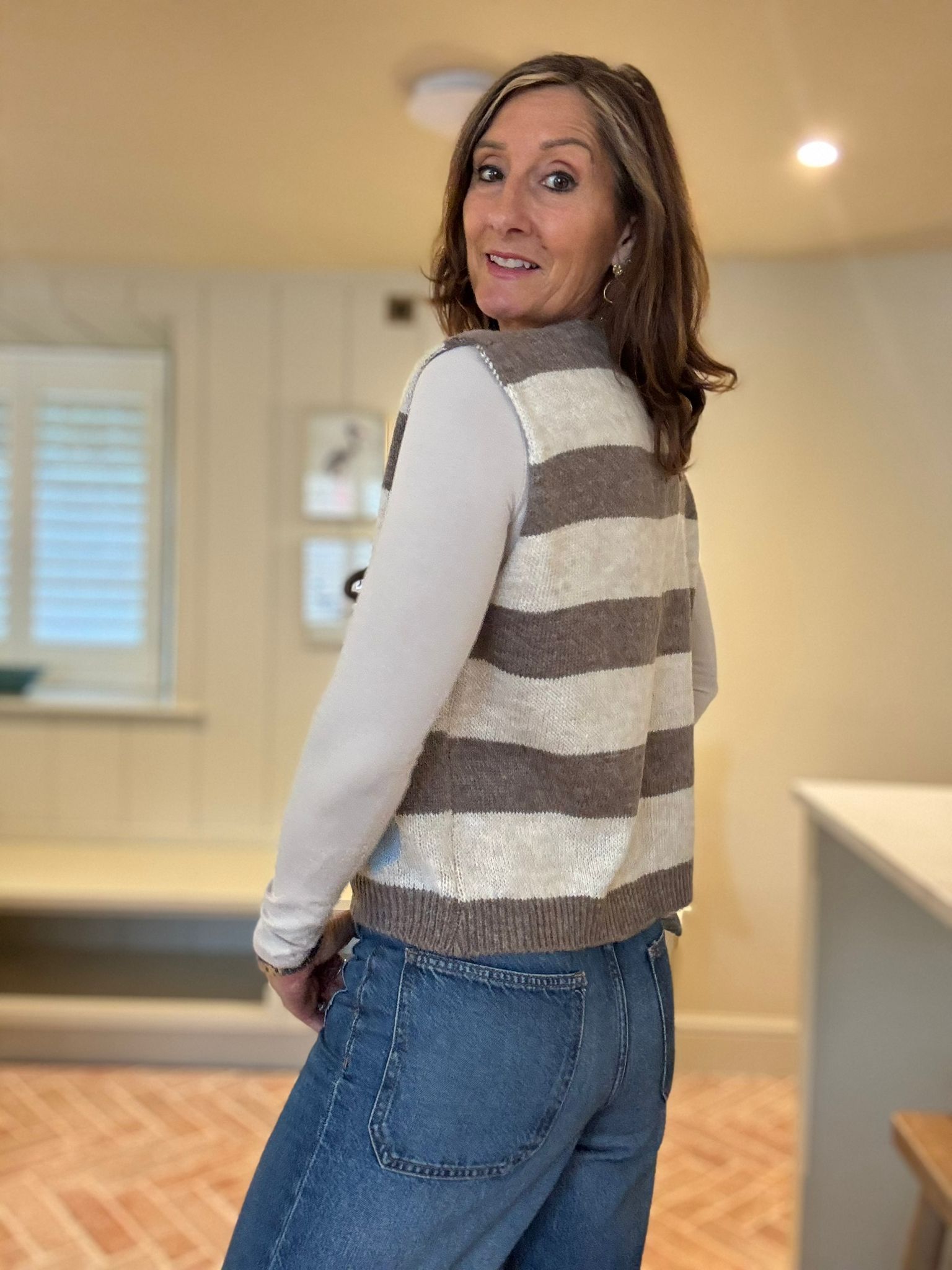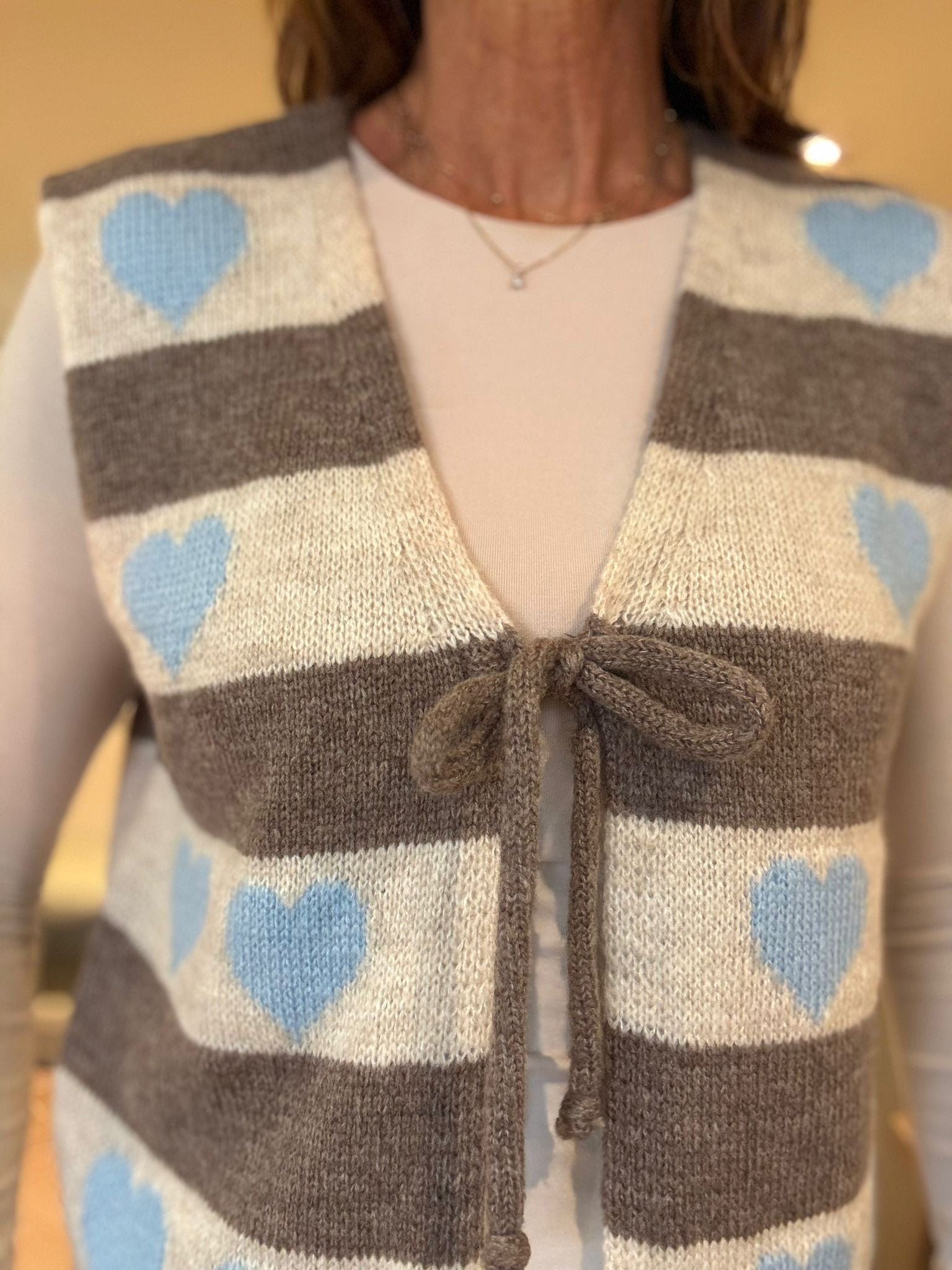 A really fun way to layer this season. The soft knitted waistcoat has a tie front and cute blue hearts, this looks brilliant over jeans and adds interest to your autumn outfits.