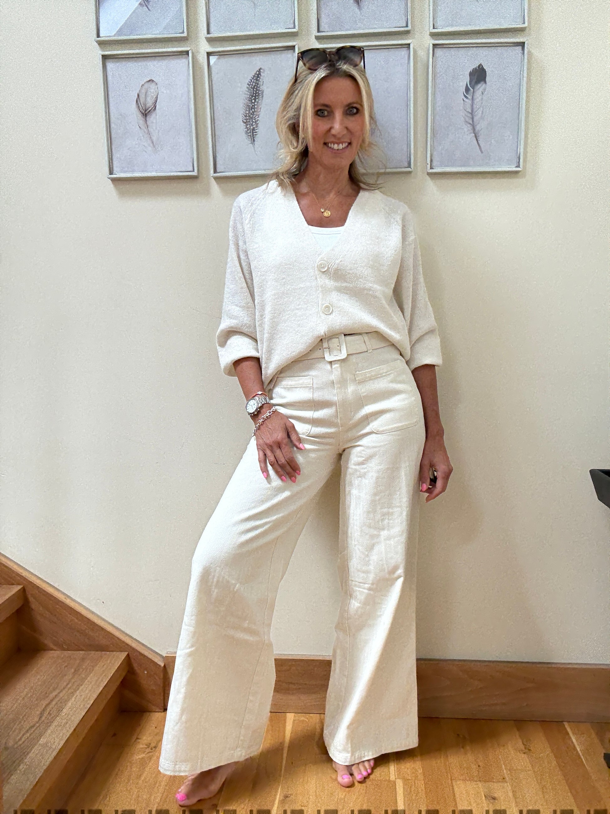 Our new go-to knit for just about every outfit! We wear this over jeans, shorts, skirts and the low v neck and slouchy fit make this a comfortable and versatile item in your wardrobe. This colourway means you can pair this with dark denim, black or any of those autumn hues for a tonal wardrobe look.